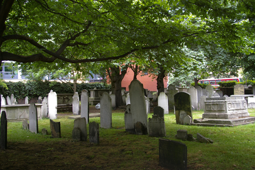 The name “Bunhill Fields” probably derives from “Bone Hill”. This dates back to 1549, when over a thousand cartloads of human bones were brought from St Paul’s (soon to be demolished) charnel house. The remains were spread over the moor and covered in soil, creating a flat ‘hill’ in the otherwise marshy landscape.