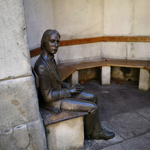 If you walk across the courtyard and through the further colonnade, you’ll find two more squares opening up to either side. On the left, there is a statue of Keats himself, by Stuart Williamson, installed in 2007. I have sat there in the little shelter a few times, in search of peace.