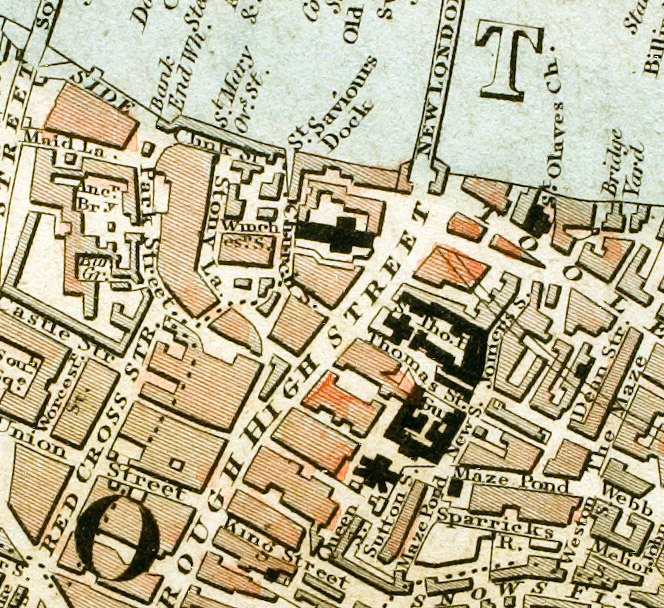 The Tooley Street page on Wikipedia suggests that Keats’ Dean Street equates to the northern end of Weston Street, which “connected with Tooley Street opposite Hay’s Galleria”. However, the Schmollinger map clearly shows Dean Street running parallel to The Maze, on the west, and Weston Street running directly into The Maze.