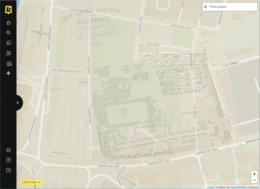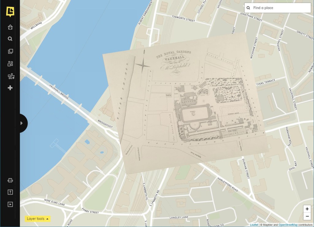 With thanks to the Layers of London site, overlaying “The Royal Gardens Vauxhall” (1841) by John Grieve on today’s Google Maps.A close-up of the above, showing how today’s green space overlaps with the Gardens as they were in 1841.