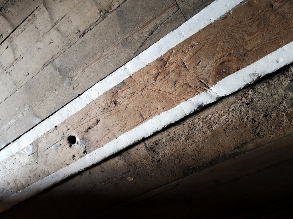 I am not entirely sure of the chronology here, but the double doors leading from the Dorcas ward were bricked up. At some point, the internal structures of the operating theatre were stripped out. Also, some of the floorboards were disturbed in the early 1900s when electrical work was carried out relating to the ceiling of the church below.