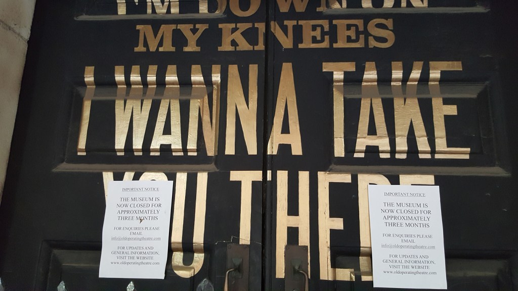 Outside the Old Operating Theatre Museum and Herb Garret. Not sure why, but the main doors feature Madonna lyrics painted in gold!
