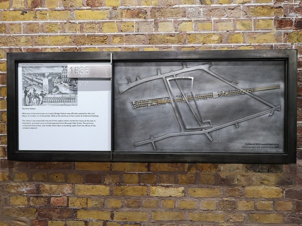Stainer (formerly Dean) Street, Southwark. Display showing the location of the first railway lines in 1836. Dean St runs up along the left of the new station concourse.